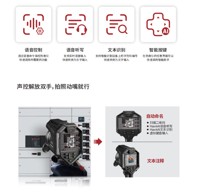 FOTRIC全新推出的HawkAI智能助手,不止具備語(yǔ)音控制、語(yǔ)音聽(tīng)寫(xiě)、文本識(shí)別和智能按鍵功能,實(shí)現(xiàn)自動(dòng)命名熱像圖,現(xiàn)場(chǎng)快速添加文本注釋。