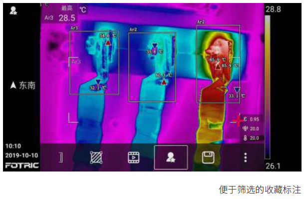 通過(guò)收藏標(biāo)注功能,用戶可以在熱像儀上快速標(biāo)記有異常的熱像圖片,并且可以在熱像儀的圖庫(kù)內(nèi)快速篩選和查找到標(biāo)注過(guò)的熱像圖片。