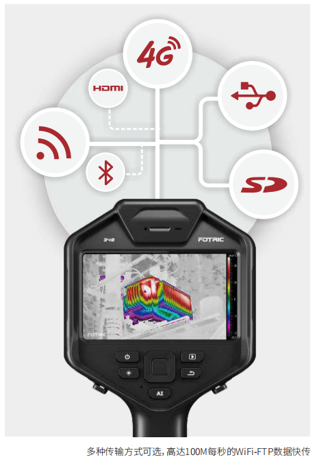FOTRIC 340系列紅外熱像儀提供豐富的數(shù)據(jù)傳輸接口,包含WiFi-FTP數(shù)據(jù)快傳,Type-C USB3.0有線傳輸,高速SD卡傳輸,4G傳輸以及HDMI、藍(lán)牙接口。