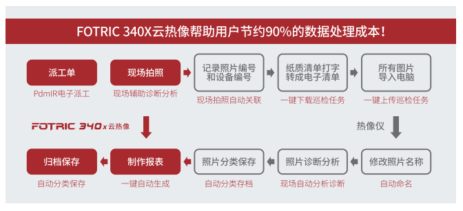 FOTRIC, 340X云熱像可以自動(dòng)實(shí)現(xiàn)待測設(shè)備與檢測數(shù)據(jù)的關(guān)聯(lián)存儲(chǔ),重塑熱像檢測流程,完全剔除了派工單打印。編號(hào)記錄、照片診斷分析、照片分類保存。制作報(bào)告等耗費(fèi)大量數(shù)據(jù)處理成本的環(huán)節(jié)。