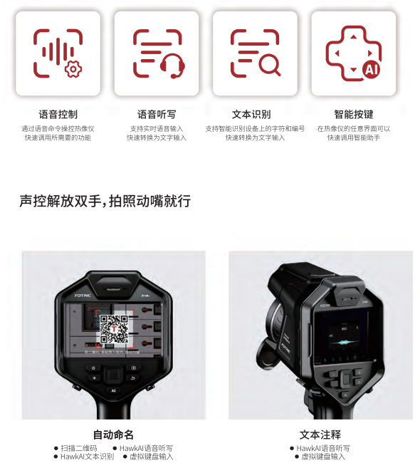 FOTRIC全新推出的HawkAI智能助手,不止具備語音控制、語音聽寫、文本識(shí)別和智能按鍵功能,實(shí)現(xiàn)自動(dòng)命名熱像圖,現(xiàn)場快速添加文本注釋。