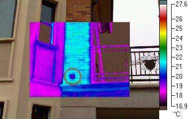 使用澆熱水的方式可以使?jié)B漏部位發(fā)生明顯的溫度分布變化,高水溫、大水量將使熱像檢測(cè)效果更為明顯,該檢測(cè)方法適合外墻表面因物品安裝位置、潮濕等原因無法直接進(jìn)行熱像檢測(cè)的現(xiàn)場(chǎng),利用水溫的變化,在房間內(nèi)部發(fā)現(xiàn)滲漏部位并加以驗(yàn)證。