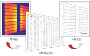 用戶可選擇任意幀熱像畫面另存為全輻射熱像圖,導出該圖全部像素點原始溫度值的.CSV格式數(shù)據(jù)表格,這些原始數(shù)據(jù)有助用戶優(yōu)化算法,或是用其他軟件生成仿真云圖。