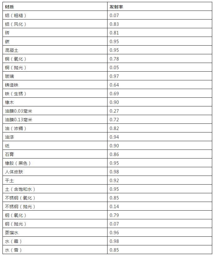 發(fā)射率除了查表外,有時(shí)還需要自己測(cè)量,因?yàn)橛泻芏辔镔|(zhì)無(wú)法查表確認(rèn),或發(fā)射率表中給的也是范圍,如氧化銅,氧化成度不同,發(fā)射率也不同,這時(shí)就需要我們直接測(cè)量物體的發(fā)射率。