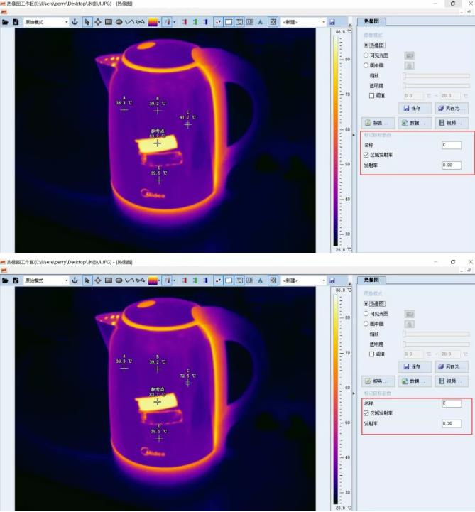 舉個(gè)例子,裝有熱水的不銹鋼水壺,因不銹鋼的發(fā)射率低,在熱像儀未設(shè)置發(fā)射率值的情況下,測(cè)出ABC三處溫度均在39℃左右,顯然不準(zhǔn)確。而貼有黑體膠帶的參考點(diǎn)處,溫度達(dá)到83.7℃,是準(zhǔn)確測(cè)溫。那么,除了貼黑體膠帶,還有哪些辦法能達(dá)到準(zhǔn)確測(cè)溫呢?