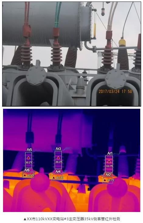 然后,根據(jù)套管熱像圖上的溫度數(shù)據(jù),來(lái)計(jì)算相間溫差,得出 A相區(qū)域最高溫Ar1與C相區(qū)域Ar5最高溫溫差為33.7-30.2=3.5K。經(jīng)過(guò)分析,從紅外圖像特征以及最大溫差為3.5K,故判定#3主變35kV套管A相為電壓致熱型危急缺陷。
